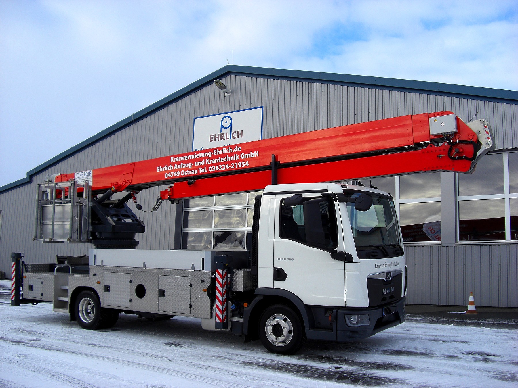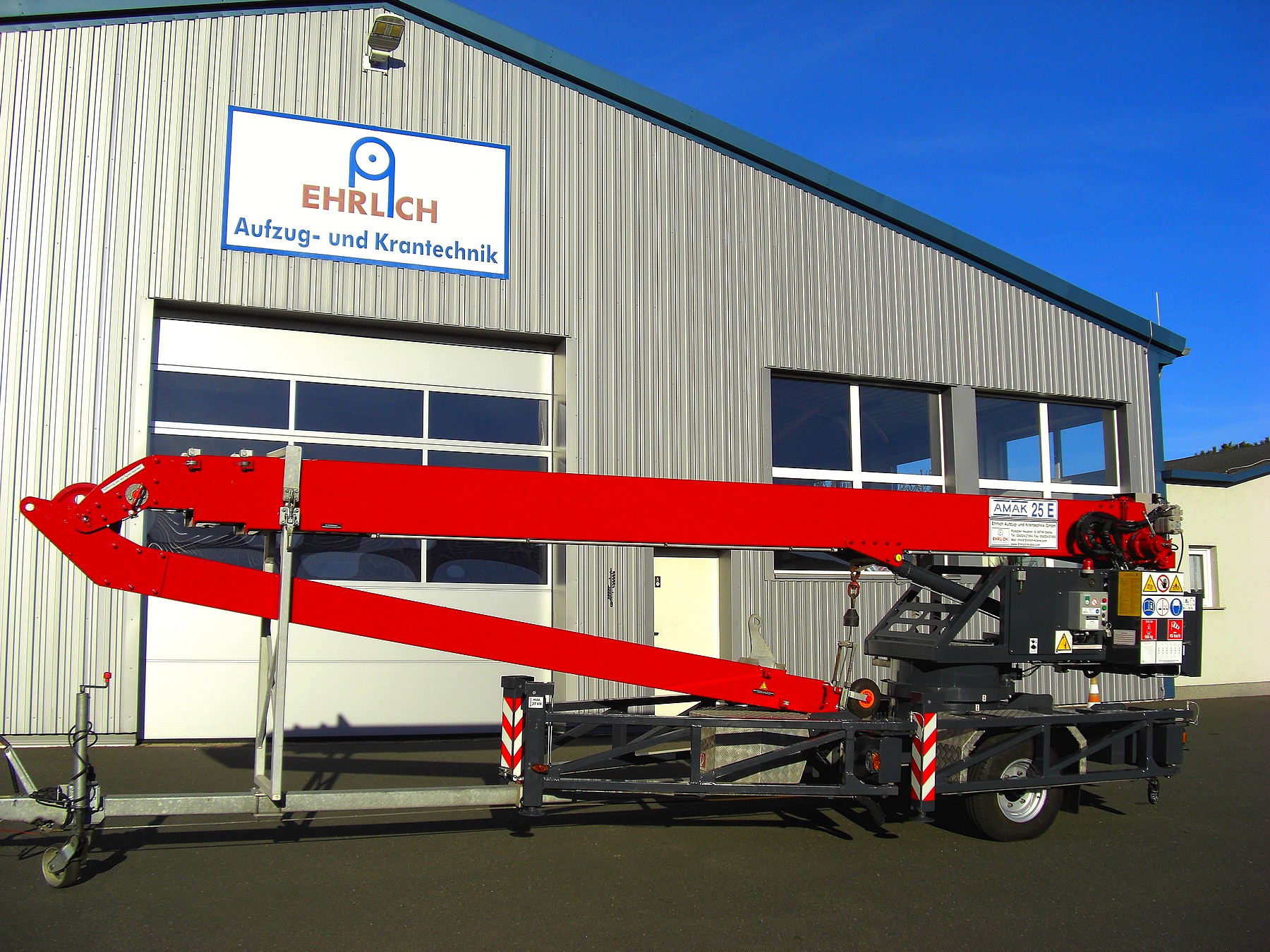Sofort lieferbares Gebrauchtgerät: Anhängerkran Typ AMAK 25 E, Ausfahrlänge 26 m, Hakenhöhe 24 m, 650 kg max.Tragkraft, Lackierung: Kranmast rubinrot RAL 3003, Kranunterbau anthrazitgrau RAL 7016. Erstzulassung August 2016 und ca. 1.100 Betriebsstunden. Guter Zustand, neue UVV- und Dekra-Prüfung.