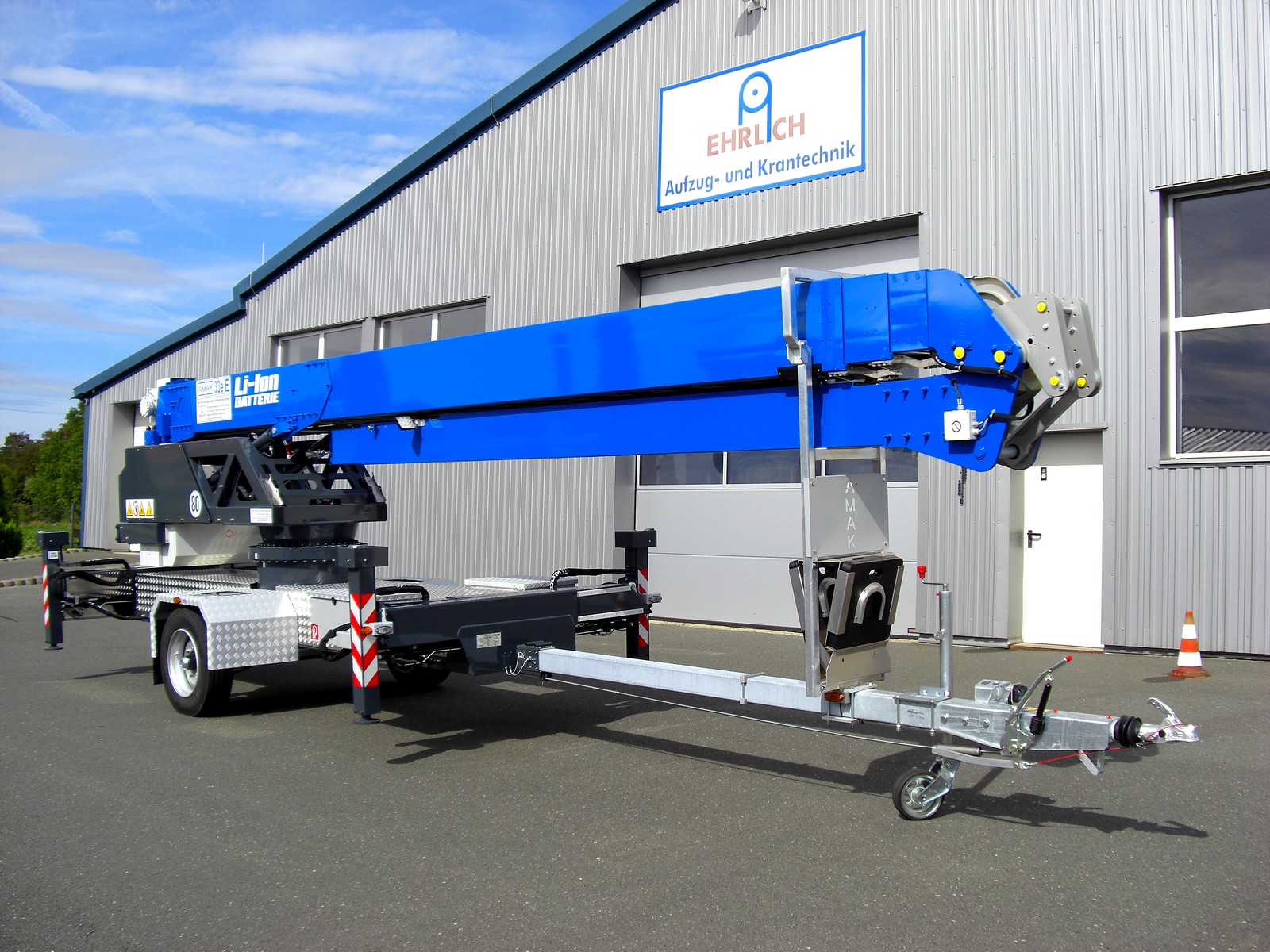 Aluminiumkranaufbau auf 3,5 t Anhängerfahrgestell, Tragkraft bis 1.500kg, 31m Ausfahrlänge, 30m Hakenhöhe. Fahrantrieb per Funkfersteuerung und einschiebbarer Zugdeichsel.